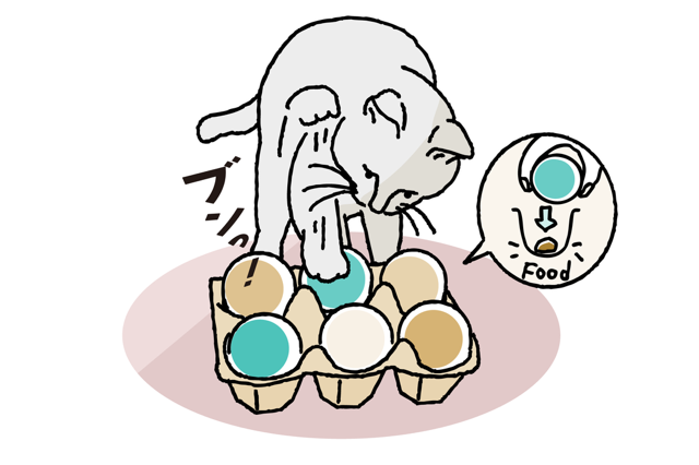 猫は、前脚を使って狩りをする習性があるため、穴の開いた箱にフードを入れたり、仕切りのついたケースに入れたりするのもおすすめ。紙製の卵パックのなかにフードを入れ、その上にボールを置いて、ボールをはたいてから取り出すようにしたり、キャットタワーの上に隠したり、いろいろ工夫してみてください。