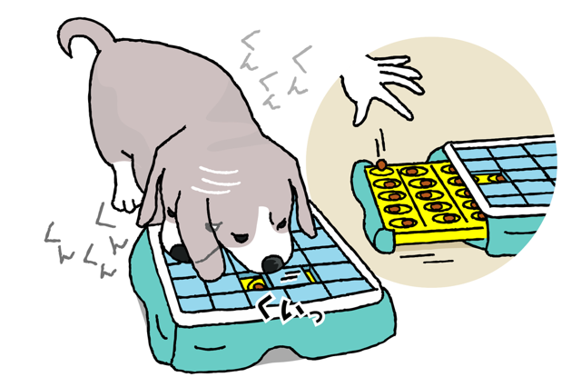 犬には、鼻を使って食べ物を探し出す習性があります。そのため、ノーズワークマットや転がすとフードが出るボール状のおもちゃ、かんで遊べるトイのなかにフードが仕込めるものなど、さまざまなタイプの知育トイを与えてみて。どれが好みかは、犬自身に選ばせましょう。鼻を使う行動は、脳にもよい刺激をもたらします。