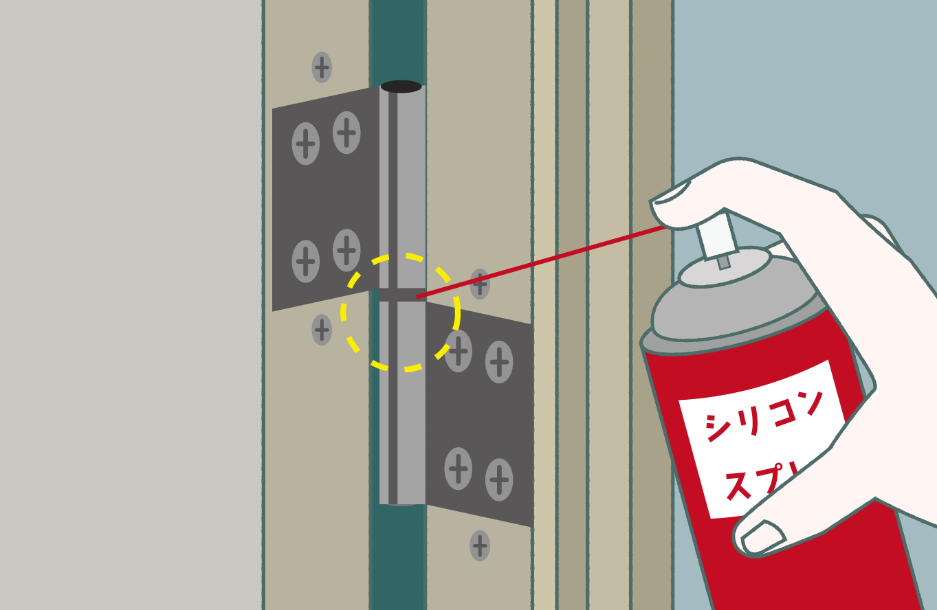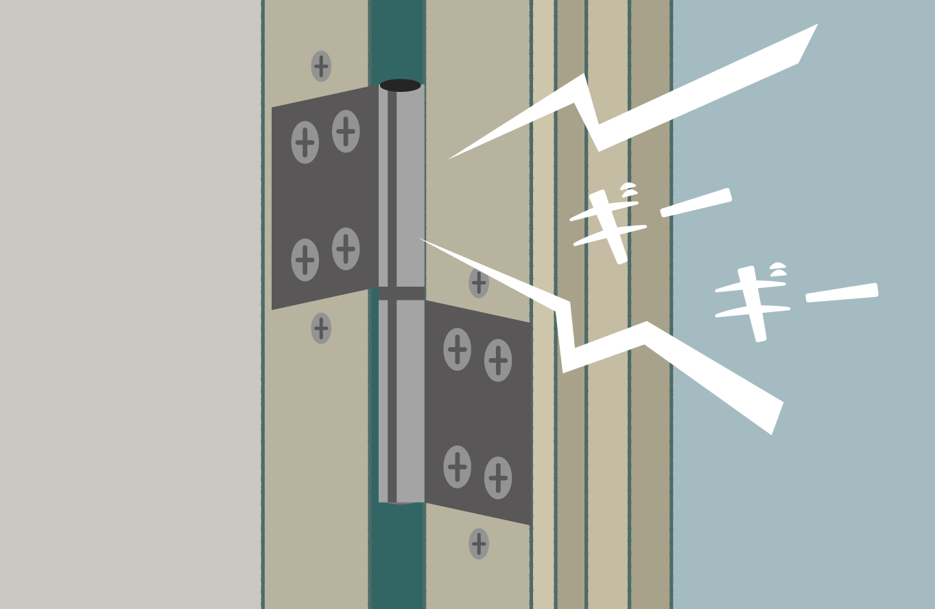 ドアの開閉時にギーギー、キーキーときしむような異音がする場合は、丁番のオイルが切れている可能性があります。注油することで解消することがあるのでぜひ試してみてください。