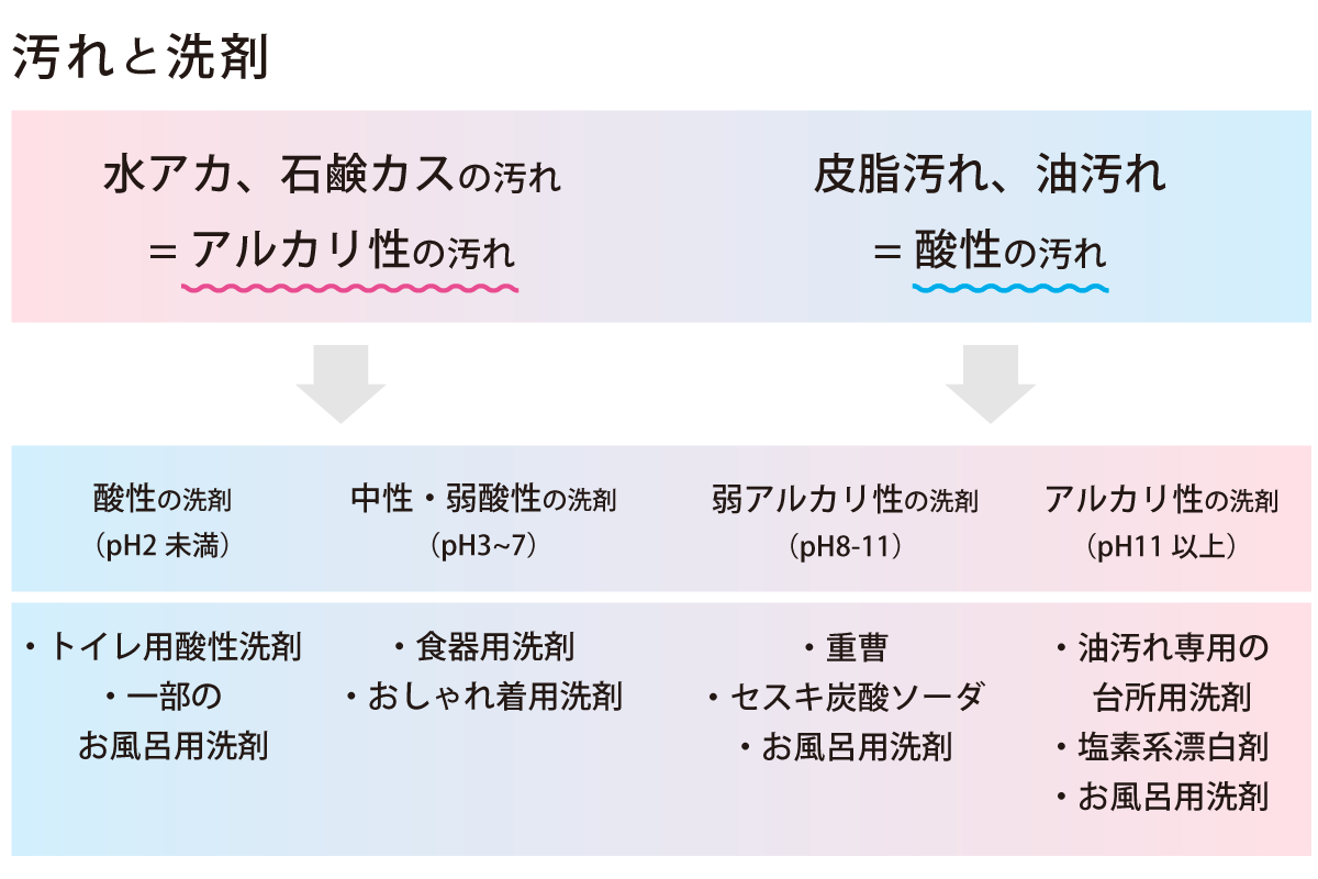 市販されている洗剤にも、酸性、アルカリ性、中性などの記載がされています。汚れの種類や用途に合った洗剤を使い分けていきましょう♪