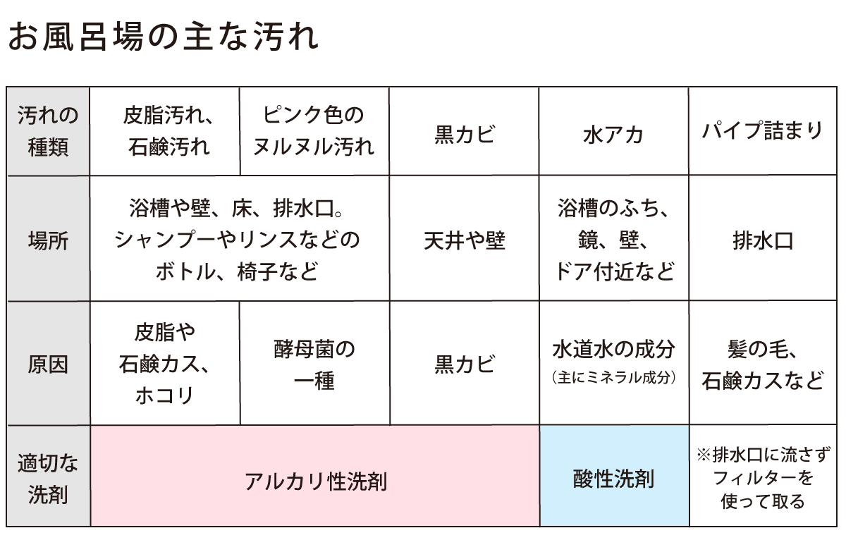 「お風呂用洗剤は、皮脂汚れを落とす弱アルカリ性の洗剤や中性洗剤が多いと思います。毎日の掃除では、浴槽や床などをお風呂用の洗剤で洗って、使用後はできるだけ水気をとっておくといいと思います。髪の毛やゴミはそのまま排水口に流さない方がいいので、髪の毛やゴミ用のフィルターを活用する方がいいですね」と園田さん。