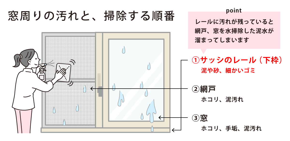 窓周りの掃除では、サッシのレール(下枠)にある泥や砂などを取り除いた後に、上部の網戸や窓を掃除する順番がおすすめです。