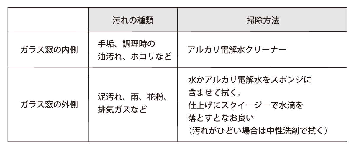 ガラス窓の内側は、室内の掃除と同じようにアルカリ電解水のクリーナーで拭けばOK。