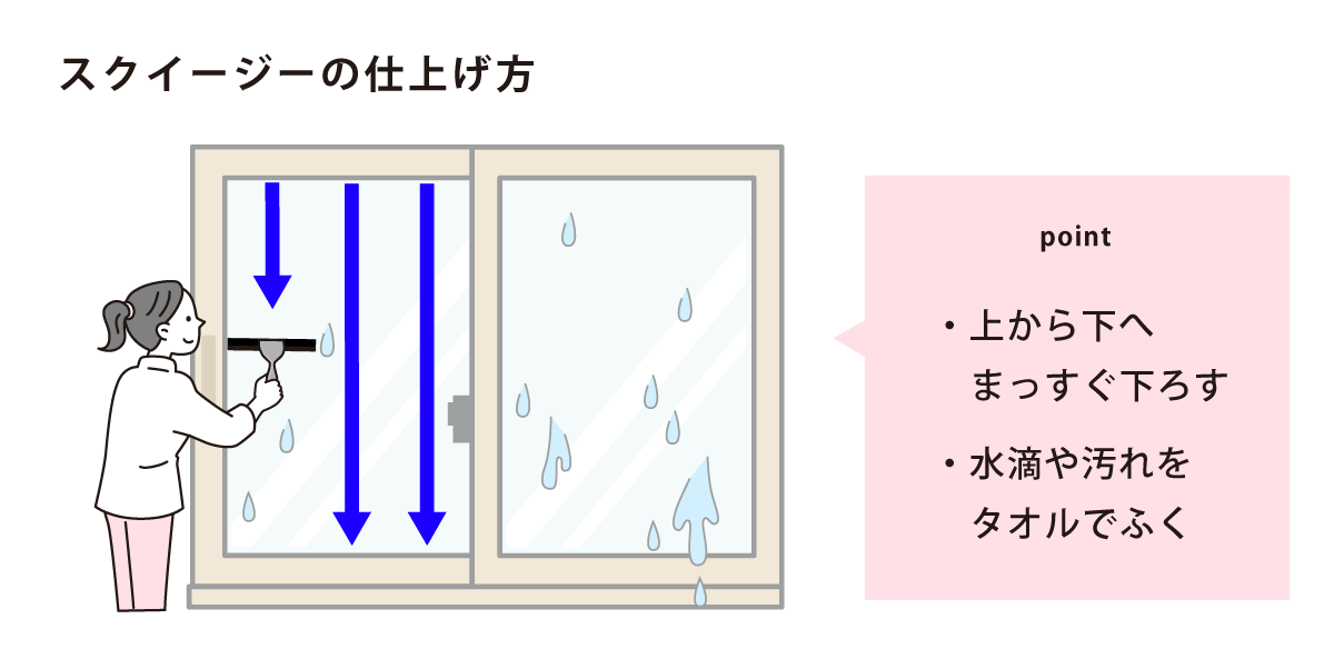 「仕上げにスクイージーを使う場合は、上から下にまっすぐ下ろすのがポイントです。下まで下ろしたところで水滴や汚れをタオルなどでふき取り、また上から下へ下ろす動きを繰り返します。前に拭いた場所と重なるように拭くときれいに仕上がります」