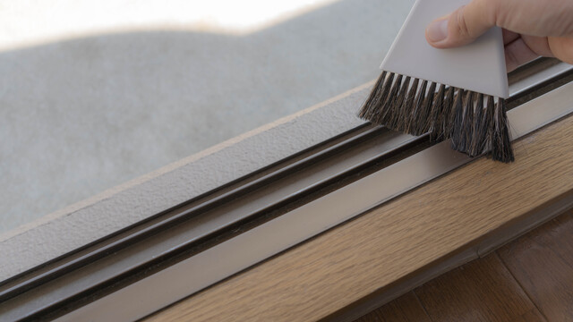 ①サッシの溝をブラシで掃き、泥や砂などを取り除く。不要な紙をサッシの溝に合わせて細く切り、ちり取り代わりにすると便利。