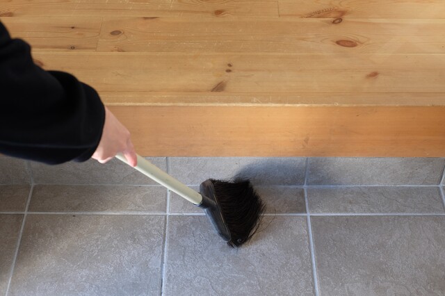 床のタイルは、靴についた泥や砂などで汚れやすい場所。ほうきを使った掃き掃除に加えて、時間がある時に水拭きをすると、さらにキレイな状態をキープしやすくなるそうです。