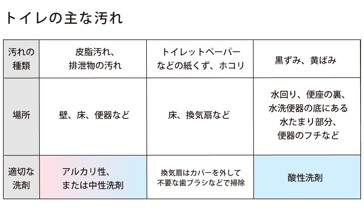 「黒ずみや黄ばみ汚れは、水道水に含まれる成分と黒カビ、尿、ホコリなどが結合して固まった水アカの一種です。いつもの拭き掃除でホコリを取った後、汚れに酸性洗剤をつけてブラシなどで丹念にこすって落としていきましょう」