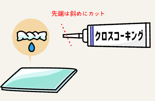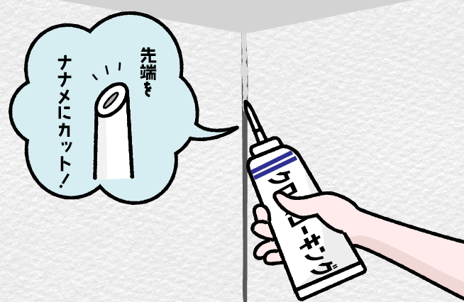 ①クロス用コーキング材の先端を斜めにカットし、壁紙の継ぎ目に沿ってコーキング材を直接充填する