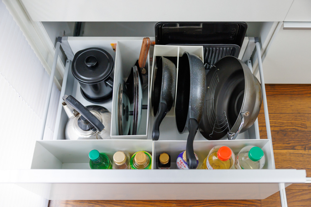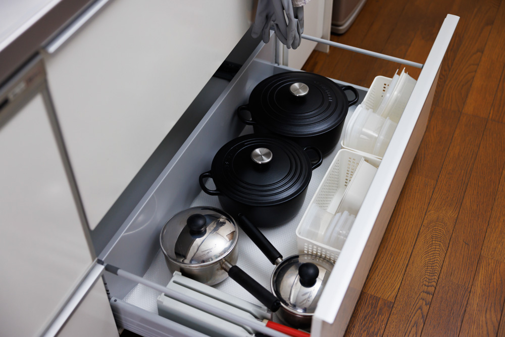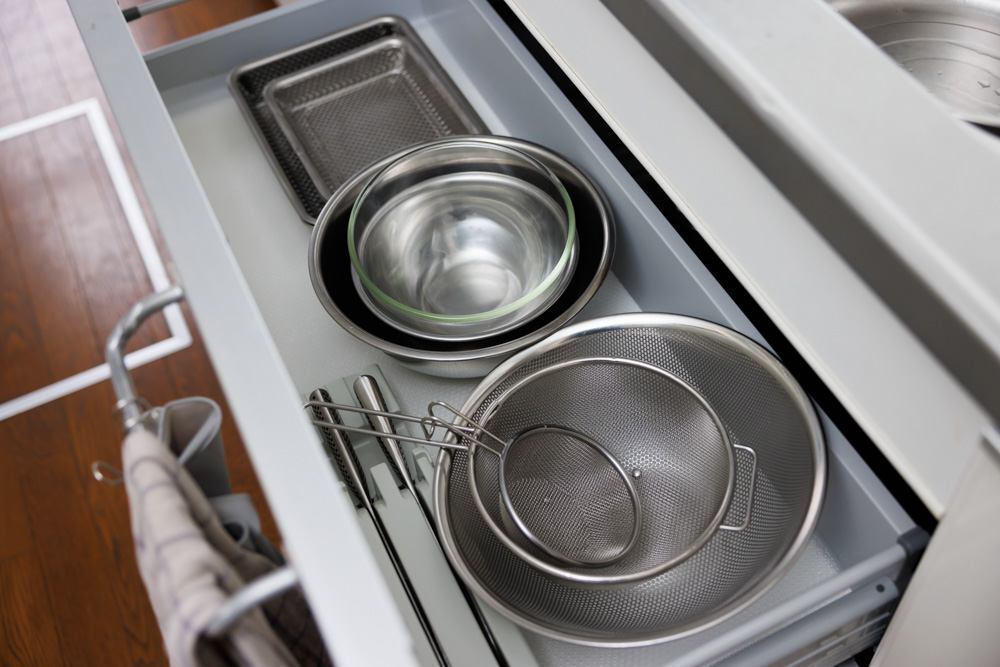 前述のザルやボウルを入れている引き出しも、かなり余裕がありました。モノで溢れていないので、誰が使っても見やすく、一目で全体が把握できます。