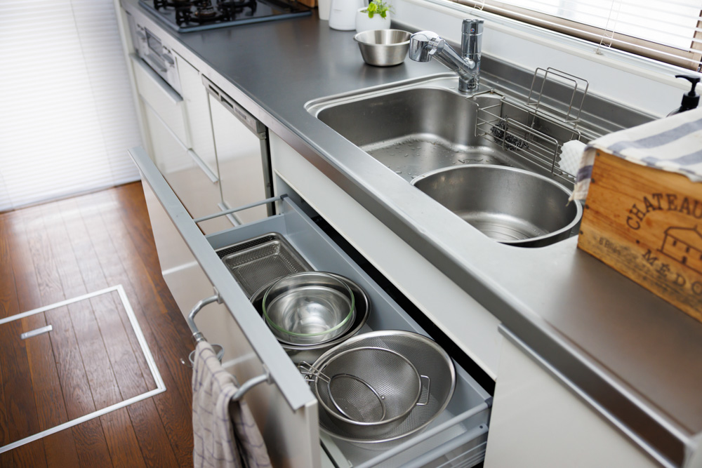 園藤さん宅のキッチン。シンクの真下にある2つの収納の上段には、ザルやボウルなどを。下段には(ざる・ボウル・鍋)を収納していました。シンクの下には基本的に水を使用する時に使うものを、すぐ使えるようにスタンバイするのが基本です。