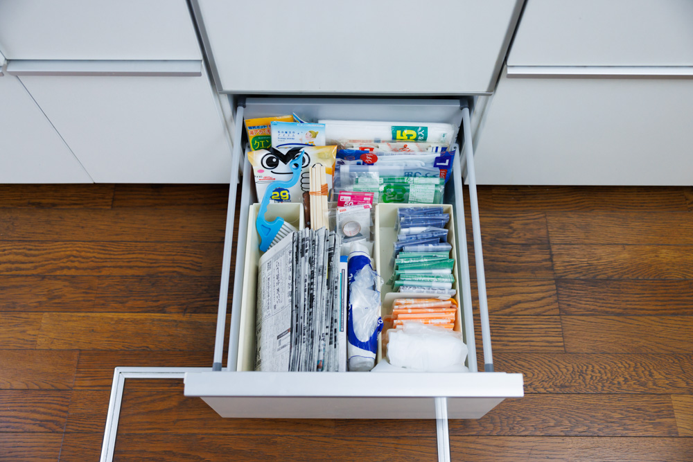 ゴミ袋など消耗品をまとめている引き出し。必見なのは、有料のゴミ袋を1つずつ小さくまとめて収納していること!(右端手前)。ゴミ捨て当日、袋から取り出すときに包装袋を不用意に破ってしまったり、2枚取り出してしまったり、残りが何枚あるのか把握しづらかったり…そうした諸問題を、見事にクリア!