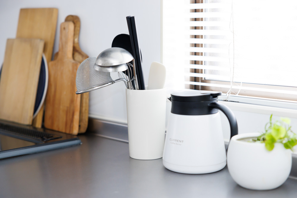 よく使う1軍のラインナップはまな板、菜箸、おたま類、しゃもじ、小型ポット。小さな植物を置くことで、気持ちもリフレッシュします。