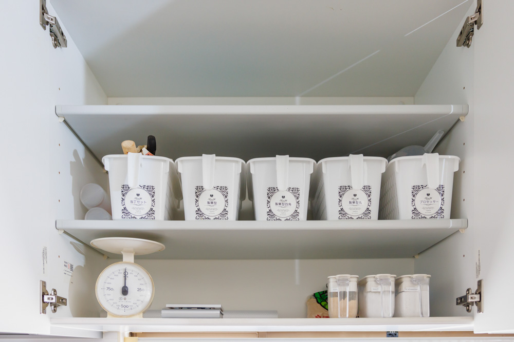 シンクの上にある吊戸棚です。手が届きにくいので、利用頻度の低いお菓子作り関係のアイテムやプロセッサーなどを収納していました。右下にあるのは砂糖や塩など。「もちろん料理中はコンロの近くに置いていますが、コンロ近くに置きっぱなしだと油とホコリでベタベタになってしまうので、使用後はここに収納しています」