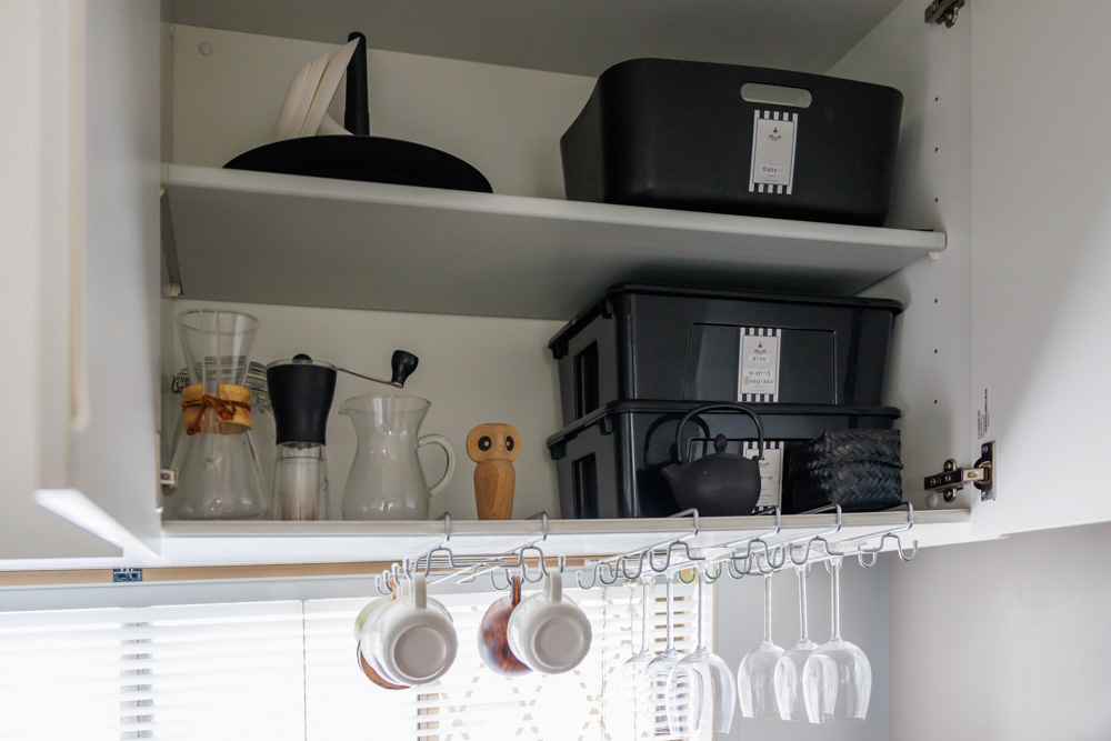 こちらもシンク上にある吊戸棚の画像。黒いボックスには、利用頻度の低い大皿や来客用のおもてなしグッズなどが入っています。