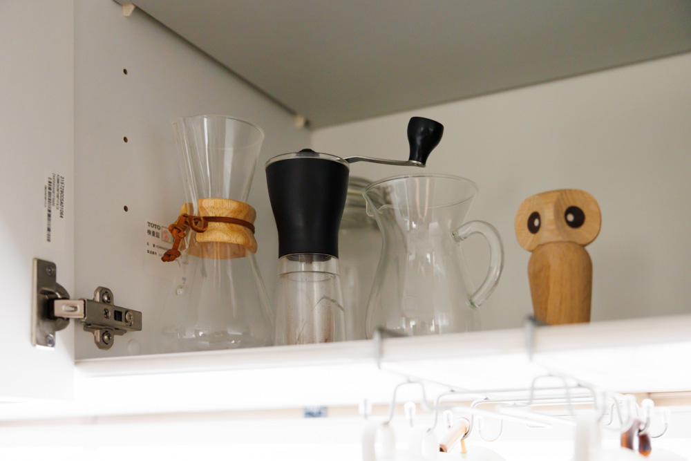 シンク上の吊戸棚にしまっている、お気に入りのコーヒー関連グッズ。かわいい置物を置く余裕が素敵すぎます。扉を開くたびに心が和みそう。