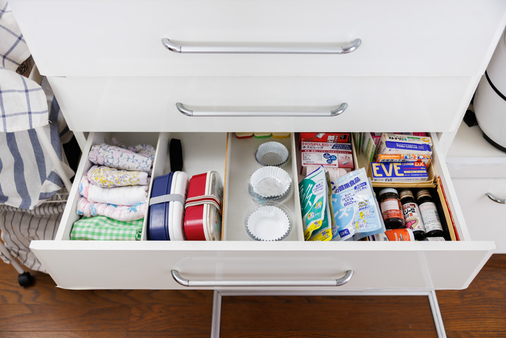 園藤家では、薬はキッチンに収納されていました。「薬は水と一緒に飲むので、シンクの近くにあった方が便利なんです」。動線に沿った無駄のない配置です。