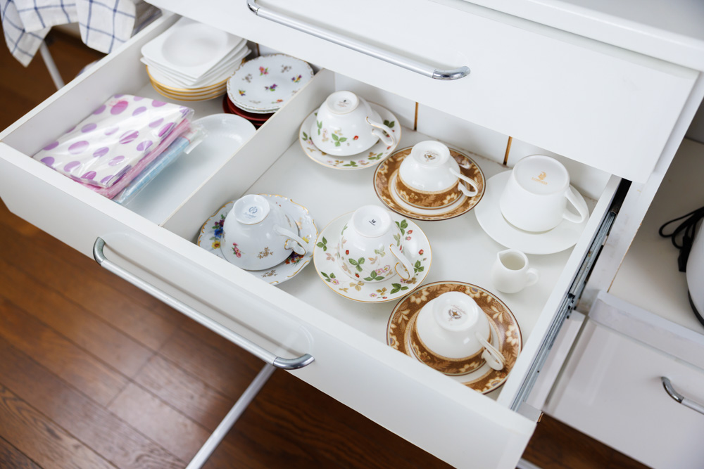 カップアンドソーサー類も、好きなものだけを。数を絞っているので選びやすく、戻しやすさも抜群です。