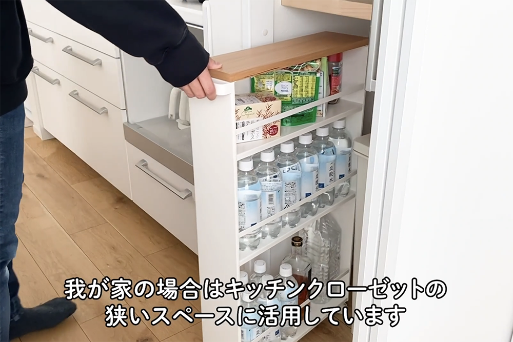 省スペースで十分な収納場所として使えるキャスター付きのスリムワゴンは、キッチンやクローゼットで使いやすい。