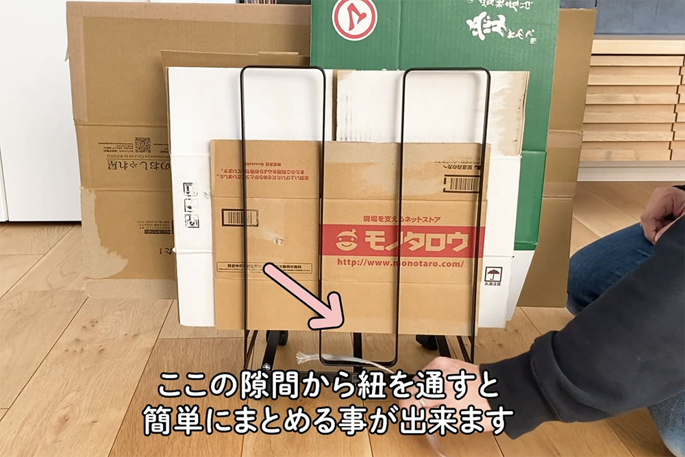 紐を通す隙間があるので、簡単にまとめることができるダンボールストッカー。